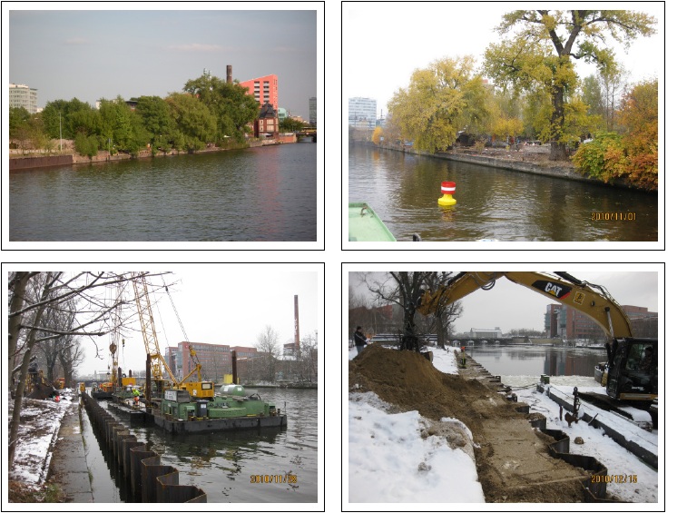 Die Sicherung der Uferwand erfolgt mit einer wasserseitig davorgesetzten Arbeitsspundwand. Der Zwischenraum zwischen Arbeitsspundwand und Uferwand wird mit Bodenmaterial verfüllt.