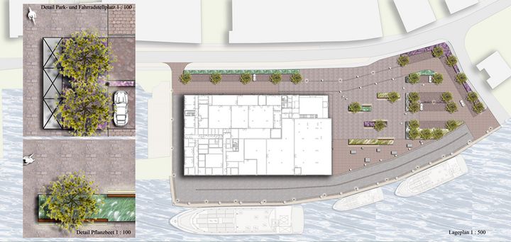 Resultierend aus dem Gebäudeneubau mit den vorgenannten Eigenschaften ist auch die Infrastruktur der Außenanlagen anzupassen. Die Neuplanung der Außenanlagen soll den umliegenden Hafencharakter aufgreifen und die Erschließung des Institutes durch eine ansprechende Gestaltung sicherstellen.