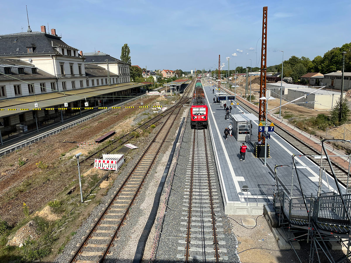 Altenburg station with its extensive is currently being modernised. New construction and reconstruction work is being carried out across all trades and the respective facilities are being adapted to the current state of the art. The modernised ESTW in Altenburg has been in operation since 11.06.2022. Utilising the final condition of tracks 5 and 7, an interim bypass was created by means of two auxiliary bridges, an interim platform and an alignment during construction.