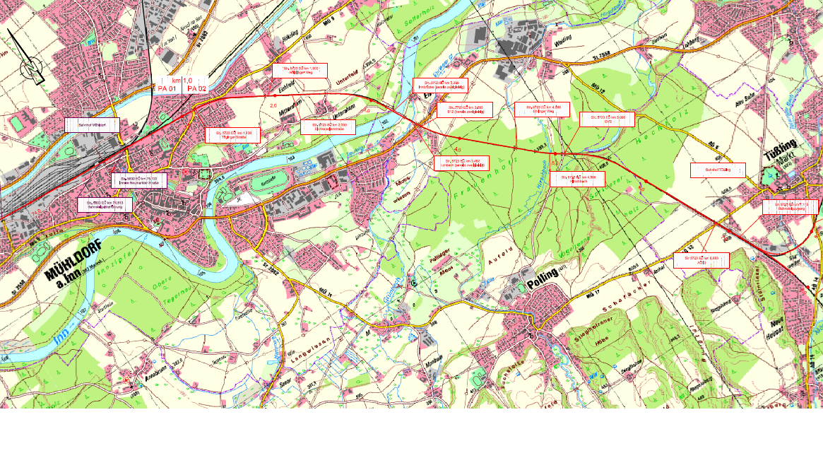 To increase capacity, the Mühldorf station was rebuilt in several construction phases and the Altmühldorf - Tüßling section was upgraded to two tracks for a line speed of 160 km/h. The single-track Altmühldorf - Tüßling section was also upgraded to a double-track section.