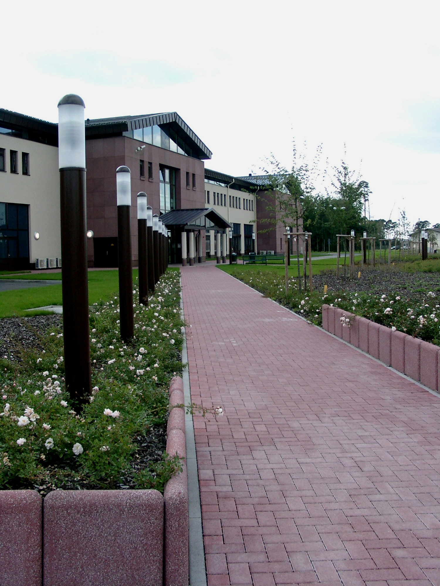 The new building is a building type arranged at 60° angle with 2 differently utilized wings and an open lobby extending over two floors located in the connection point of the building wings. A specialty is the arms vault and the requested windowless planning area. The reduced load-bearing capacity of encountered soil conditions (former swampland) necessitates an increased expenditure for building foundations with a strong reinforced concrete foundation slab.