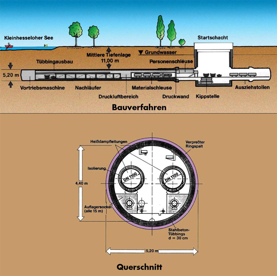 The new compound pipeline, which connects the inner-city part of the network with the recently expanded waste power plant north, passes under the famous English Gardens urban park with its highly sensitve ecology. The project embraced one concrete pipe with an internal diameter of 4.40 m, into which were inserted 2 steam lines and 3 condensate lines.