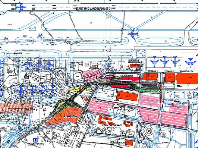 Gleichzeitig soll mit der Planung die Vorfahrt zu dem zukünftigen Terminal 2 und die Verkehrsanbindung der bestehenden HCH-Halle und der bestehenden und geplanten Parkflächen sichergestellt werden. Hierfür ist der Ausbau des vorhandenen Straßennetzes in diesen Bereichen erforderlich. Im Rahmen dieser Baumaßnahme sind alle öffentlichen Ver- und Entsorgungsleitungen innerhalb der geplanten Straßenführung neu herzustellen und mit dem vorhandenen Ver- und Entsorgungsnetz zu koordinieren.