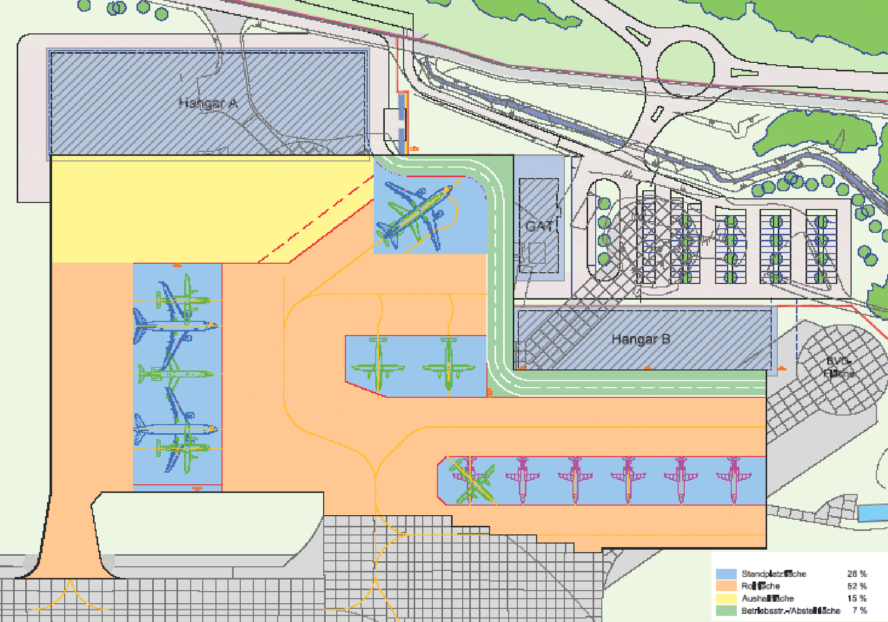 Neubau einer Vorfeldfläche in Beton, für die Allgemeine Luftfahrt im Bereich der „Lima-Platte“ mit einer vorläufigen Größe von ca. 35.000 m². Für die Fläche liegt ein Konzept vor, die funktionalen und technischen Angaben in dem Konzept wurden verifiziert.