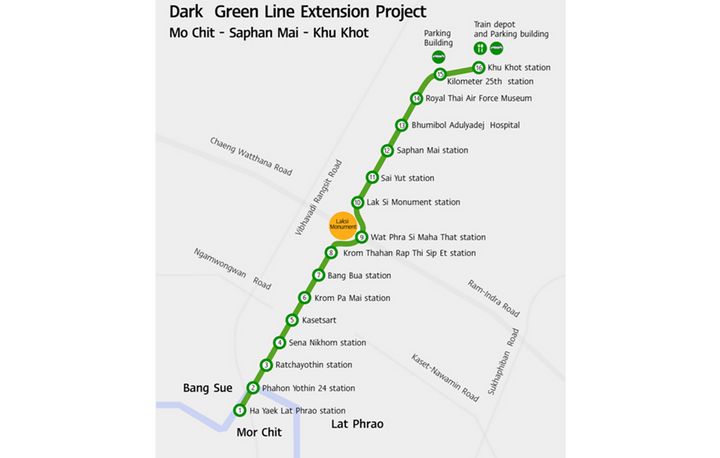 According to the cabinet’s meeting on November 27, 2008 the cabinet has approved the Mass Rapid Transit Authority of Thailand (MRTA) to operate the construction of the Green Line: Mo Chit – Saphan Mai section and also, the Green Line: Bearing – Samut Prakan section. This route is 25 kilometers long. Later on, the cabinet had a meeting on March 9, 2010 acknowledged of the commission of the management of road traffic’s meeting summary no. 1/2010 on February 8, 2010 approved to extend the Green Line from Mo Chit – Saphan Mai to Mo Chit – Saphan Mai – Khu Khot section. The depot at the south of Don Muang Airport had been cancelled and build another depot near Khu Khot station instead.