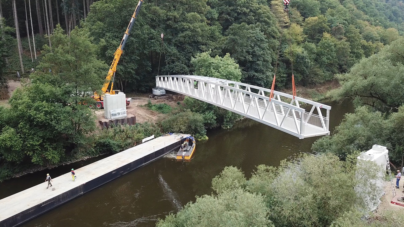 Two structures for cyclists and pedestrians to cross the Lahn were built along the cycle path. The structures were built identically in aluminium with a span of 49 m each and two foreshore bridges with a length of 15 m each. The special feature of the planning measure was the extremely cramped conditions in the Lahn valley, so that the structures had to be transported and assembled via pontoons.