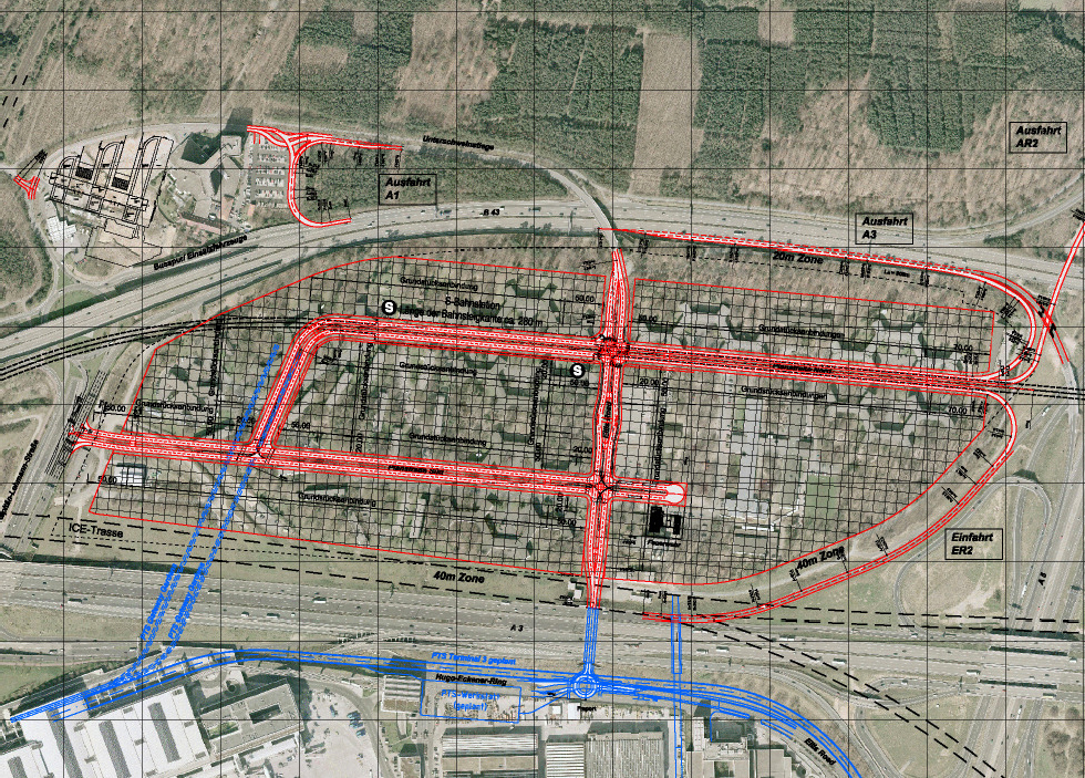 - Objektplanung Verkehrsanlagen Straßenbau, Innere Erschließung mit zwei Fahrbahnen mit Mittelstreifen, Kreisverkehrsplätzen, signalisierter Knotenpunkt, Geh- und Radwegen, Anlieferungsstraßen sowie äußere Erschließung mit Anschluss an das städtische Straßennetz, der B43 und der BAB A5(gem. § 46 HOAI, Lph. 1 – 9 Verkehrsanlagen)