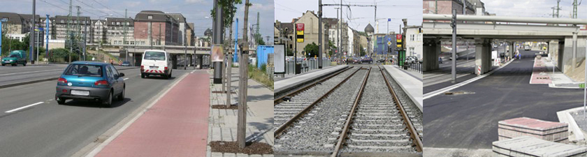 Verkehrs- und Straßenbaumaßnahme mit Neugestaltung des Straßenquerschnittes und Gleisanlage mit besonderem Gleiskörper. Die Maßnahmen nach dem Eisenbahnkreuzungsgesetz § 12 (2) einschl. Verantwortung für Abrechnung der Kreuzungsvereinbarungen mit der Bahn. Umverlegung eines Mischwasserkanals DN 2400 mit Durchörterung des Bahndamms. Erneuerung des gesamten UVN mit allen Ver- und Entsorgern, sowie Abriss von Hochbauobjekten und Grunderwerb, Verkehrsbaumaßnahme mit Leitungsum- und Neuverlegungen, Mitwirkung bei Erstellung der EKrV, Abrechnung der Eisenbahnkreuzungsmaßnahmen und Durchführung der vertraglichen Abstimmungen und Vorbereitung der Verträge.