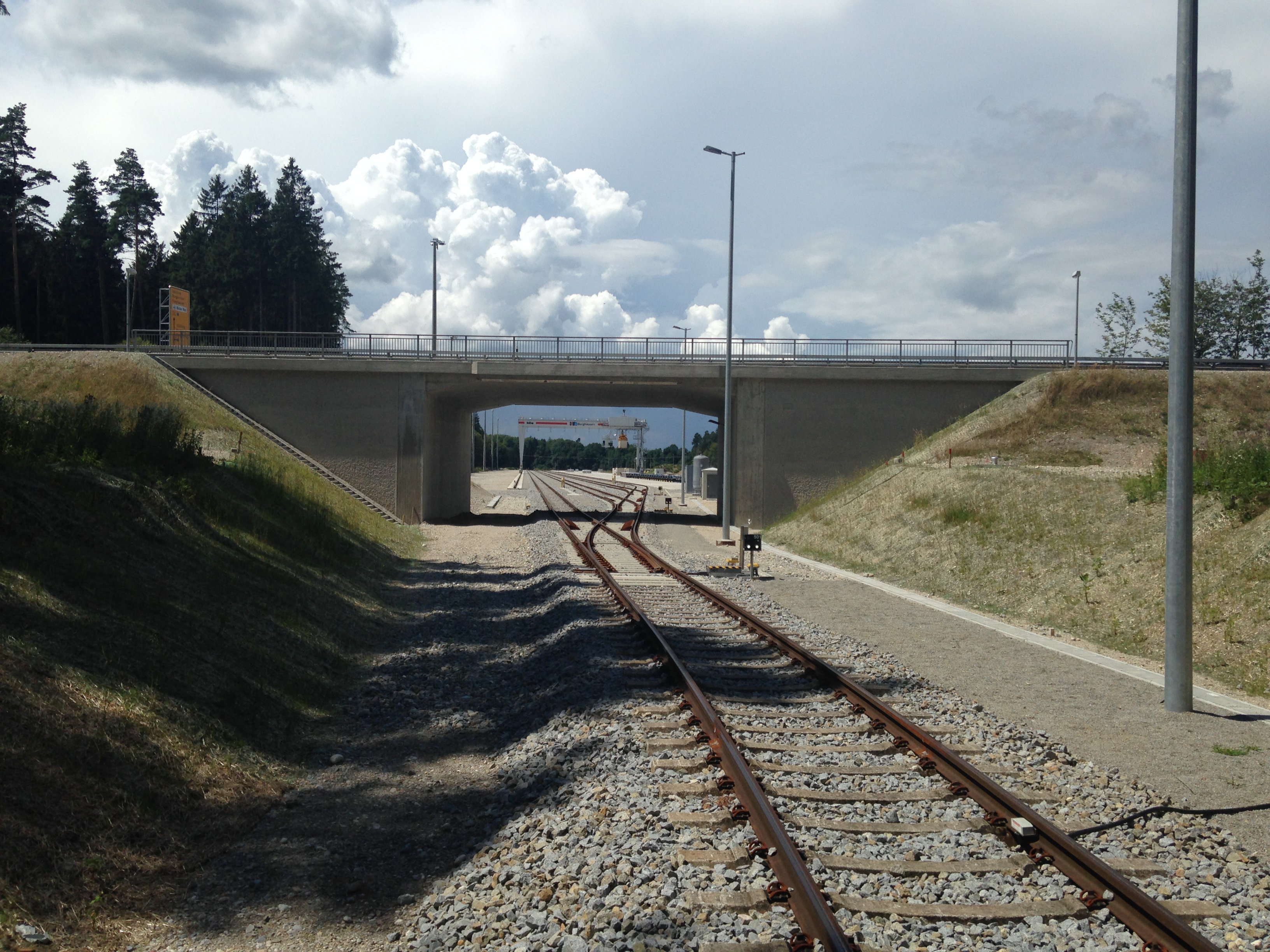 A new road overpass will be built to create a grade-separated crossing between the CT terminal siding and the two-lane federal road and the parallel footpath and cycle path. Due to the necessary useful track lengths in the terminal, two tracks have to be transferred in the crossing area.